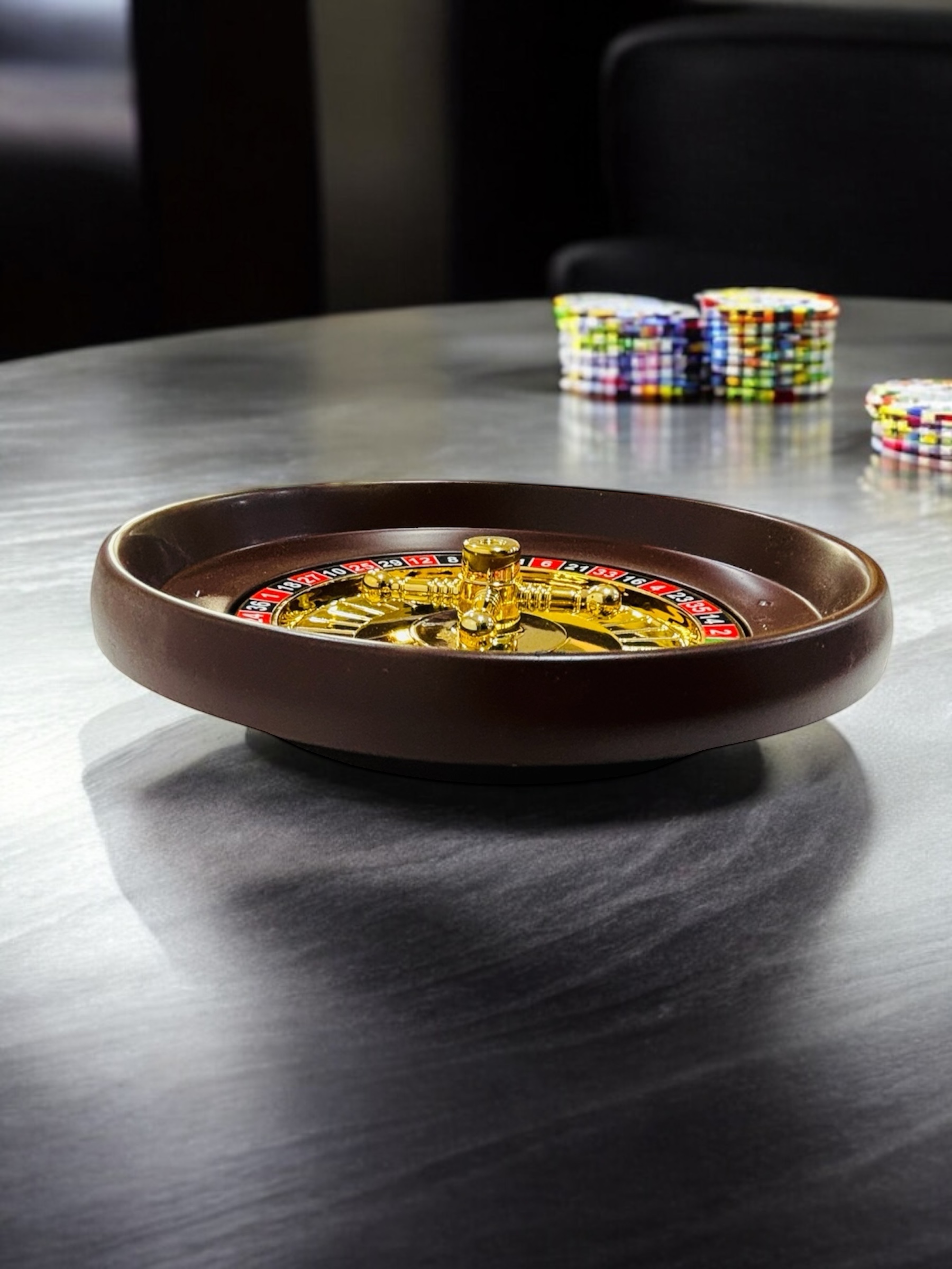 A high-quality spinning roulette wheel with golden accents